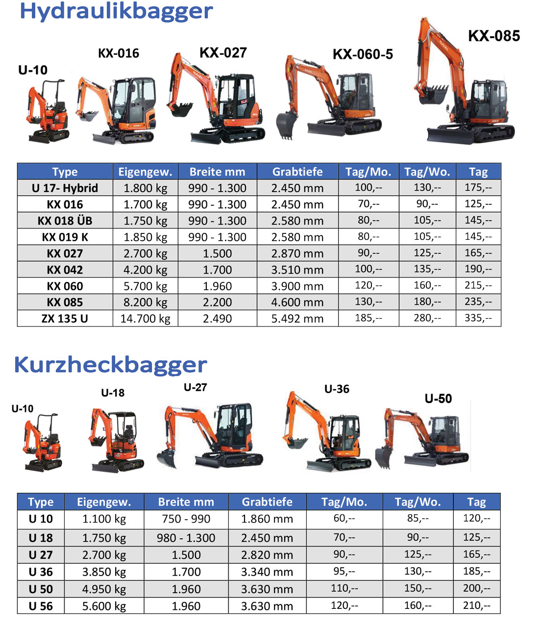 Sie müssen bei Ihrer nächsten Baustelle eine Grube ausheben und benötigen dafür einen Bagger? Bei Fercher Baumaschinen erhalten Sie kurzfristige Unterstützung. Wir bieten Ihnen ein breites Angebot an Kompakt- und Kurzheckbaggern, die Sie für die Dauer Ihrer Baustelle mieten können. Auf dieser Seite finden Sie eine Übersicht über unsere Bagger und die Preise.