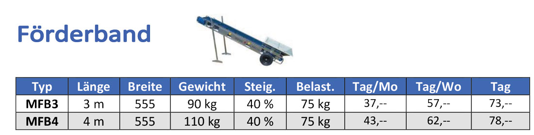 Bei Fercher Baumaschinen bieten wir Ihnen ebenfalls Förderbänder zur Miete an. Auf dieser Seite finden Sie eine Übersicht über die verschiedenen Modelle und Längen unserer Förderbänder und unsere Preise. Wir beraten Sie gerne und beantworten Ihnen Ihre Fragen zu unseren Förderbändern. Rufen Sie uns noch heute an und erhalten Sie Ihr individuelles Angebot zur Miete eines Förderbandes.